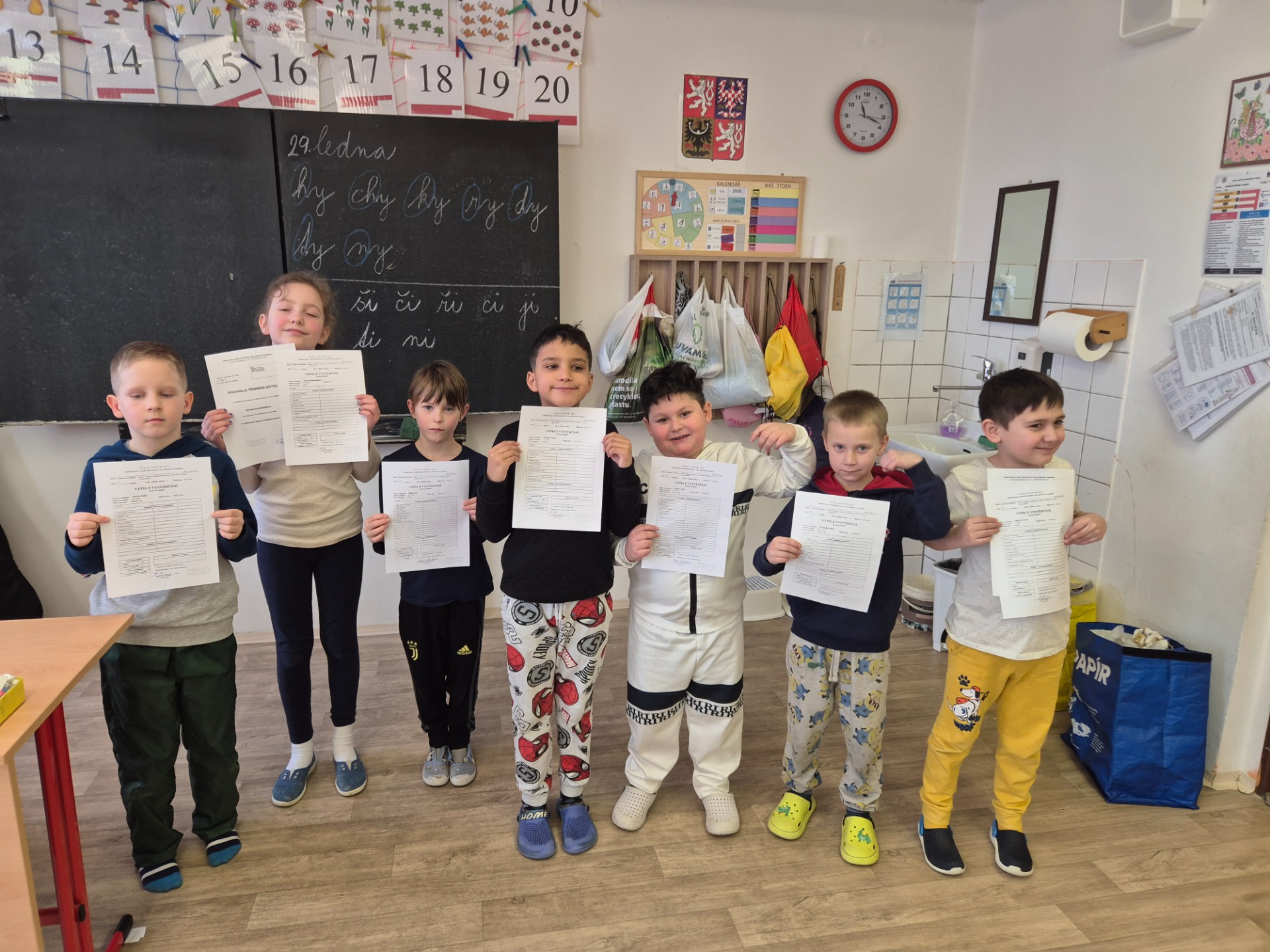 Poslední lednový den v naší škole patřil velké slávě. Zatímco pro prvňáčky to byla úplná premiéra, naši druháci už přesně věděli, co je čeká. Paní učitelka nejprve s dětmi zhodnotila celé první pololetí. Poté už přišla ta hlavní chvíle. Každý žák si za potlesku spolužáků došel k tabuli pro svoje vysvědčení. U většiny dětí převládaly jedničky. Teď už na naše malé školáky čekají zasloužené jednodenní pololetní prázdniny.